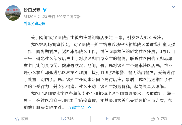 人民网北京3月21日电 据硚口发布微博消息,3月20日,武汉市硚口区委宣传部在其官方微博通报称,关于网传“同济医院护士被租住地的邻居驱赶”一事,引发网友强烈关注。事后,硚口区迅速指出了社区的不妥行为,并安排街道、社区主动与该护士沟通解释,获得其本人谅解。