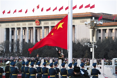 1月1日晨,北京天安门广场举行隆重的升国旗仪式,这是由人民解放军担负国旗护卫任务后,首次举行的升旗仪式。 新华社记者 申宏 摄