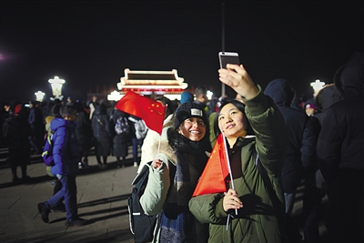 1月1日晨,天安门广场,群众举手机观看新年第一次升旗仪式。