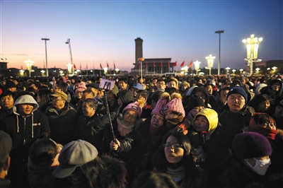 “人数更多,礼服也很好看,三军仪仗队阵势确实很大。最后大家合唱时,心里非常感动。”周杨说。与他同行的研究生韩红金说:“我们今年都要毕业离开北京了,约定毕业前做一件值得纪念的事。元旦来这里看升旗,真的很有意义。”