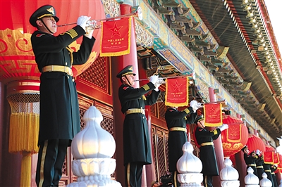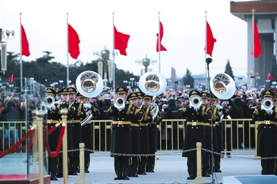 1 每月第一天升国旗增加号手和礼兵的迎旗环节。新创作《升旗号角》音乐,由8名礼号手在天安门城楼演奏,仪仗队礼兵在金水桥南侧列队。