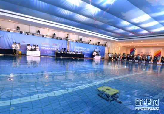 5月15日,在2019世界智能水下机器人挑战赛上,来自墨尔本大学和悉尼大学联合参赛队的水下机器人接近信息源。 新华社记者 岳月伟 摄