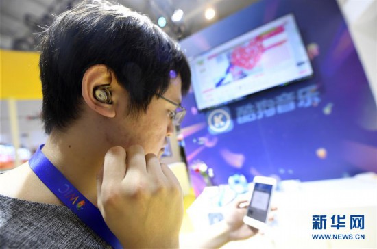 5月16日,在第三届世界智能大会智能科技展上,观众使用酷狗音乐耳机进行“语音点歌”。 新华社记者 岳月伟 摄