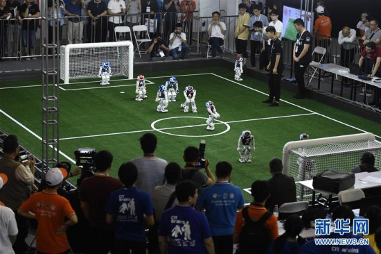 5月17日,在2019亚太机器人世界杯天津国际邀请赛中,观众在观看机器人踢足球。 新华社记者 岳月伟 摄