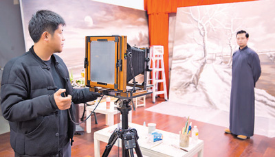 王旭(左)正在为顾客拍摄照片。 |