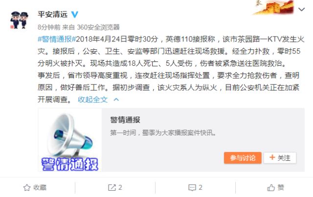 广东清远一KTV发生火灾 造成18人死亡5人受伤 2018-04-24 08:41 来源:新华社 作者: 一叶知秋 字号: 2018年4月24日零时30分,(广东省清远市)英德110接报称,该市茶园路一KTV发生火灾。接报后,公安、卫生、安监等部门迅速赶往现场救援。经全力扑救,零时55分明火被扑灭。现场共造成18人死亡、5人受伤,伤者被紧急送往医院救治。 事发后,省市领导高度重视,连夜赶往现场指挥处置,要求全力抢救伤者,查明原因,做好善后工作。据初步调查,该火灾系人为纵火,目前公安机关正在加紧开展调查。 责任编辑: 修己 相关阅读 关键词: 复制网址 打印 收藏