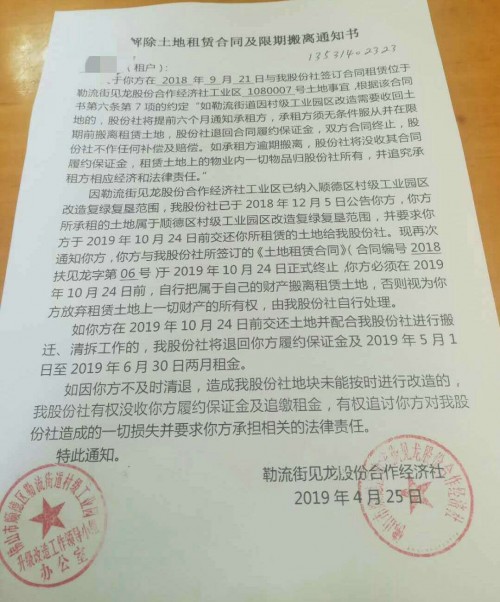 在2018年9月中下旬,要求我们续约时签订霸王条款《续租协议》《土地租赁合同》租金每亩按19000元/年缴每两年递增20%,如在9月30前不续签的又搬走的企业建筑物及物品归见龙股份经济合作社所有,不作任何补偿及赔偿。如此短时间的要求,就凭一张纸,企业十几年的投资说没就没有了。《土地租赁合同》中租赁期间承租方如需进行维修或改造新增加的装修及改造的设施归股份所有,不作任何补偿及赔偿,如勒流街道因村级工业园区改造需要收回土地的,股份社将提前六个月通知承租方,承租须无条件服从并在限期前搬离物业,股份社退回合同履约保证金,双方合同终止,股份社不作任何补偿及赔偿。如承租方逾期搬离物业,股份社将没收其合同履约保证金,物业内一切物品属股份社所有。如此的霸王条款,勒流见龙股份经济合作社村干部,不顾企业的及员工死活。想如何就如处理就如何处理。在当今中国这个法治社会,我们这此企业的权益得不到任何的保障。如不签会导致我们这些公司所有股东投入几千万元的资金都无法收回,相关部门对此事也置之不理,无不令人感到痛心。