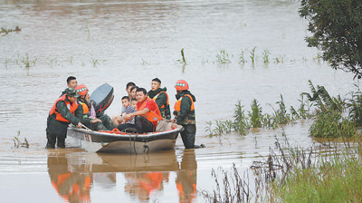 9日,在江西永新县在中乡排形村,救援人员转移受困儿童。 |