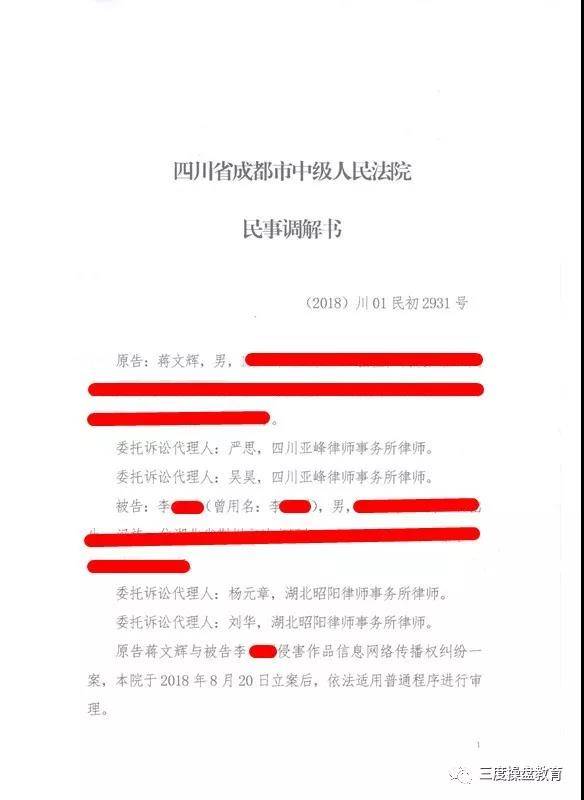 作为证券二级市场交易投资民间教育,一直都是朦朦胧胧、雾里看花。对于交易投资原创教育的维权,更没有听说过。三度敢于维权,要维权,除了自身有足够底气,更有一份社会良知。股市从来都是风险重地,有交易就有风险甚至“杀戮”。荆州李某某通过不正当手段获取三度部分面授课程资料,在并不知晓“三度操盘系统”真正要义的情况下,公然在互联网上宣讲并转发三度课件用于自身营利的同时诋毁三度,从而造成部分股民误读、误解三度系统及相关知识。李某某的一系列行为极可能直接招致股民大幅度亏损的情况发生,也损害了蒋文辉老师的声誉。