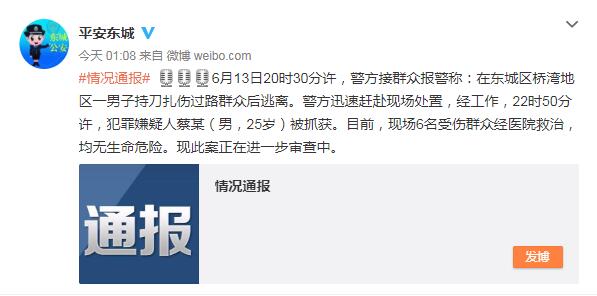 北京一男子持刀扎伤6名过路群众 伤者无生命危险 2019-06-14 07:31 来源:人民网 作者: 人民网 字号: 人民网北京6月14日电 据北京市公安局东城分局官方微博消息,6月13日20时30分许,警方接群众报警称:在东城区桥湾地区一男子持刀扎伤过路群众后逃离。警方迅速赶赴现场处置,经工作,22时50分许,犯罪嫌疑人蔡某(男,25岁)被抓获。目前,现场6名受伤群众经医院救治,均无生命危险。现此案正在进一步审查中。 责任编辑: 修己 相关阅读 关键词: 复制网址 打印 收藏