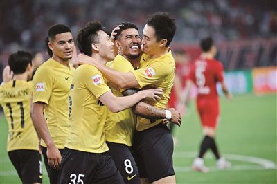 保利尼奥(右二)梅开二度。 广州日报全媒体记者 廖艺 摄