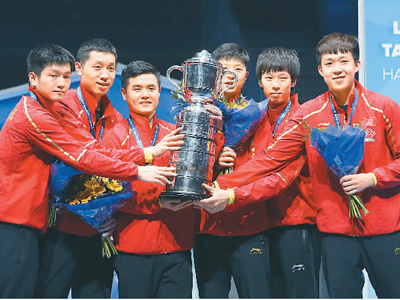 2018年5月6日,在瑞典哈尔姆斯塔德举行的2018年乒乓球世界团体锦标赛上,中国队队员和教练捧起斯韦思林杯。 |