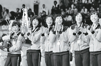 1981年11月,中国女排队员在第三届女排世界杯冠军领奖台上。 |
