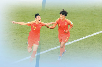 2019年6月13日,在法国女足世界杯上,中国队球员李影(左)与队友王霜庆祝进球。 |