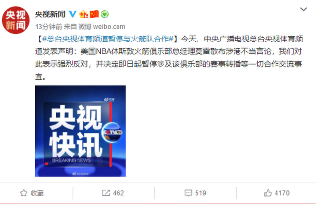 央视体育频道:暂停与NBA休斯敦火箭俱乐部一切合作 2019-10-07 10:04 来源:人民网 作者: 冯粒 字号: 央视新闻微博截图。 人民网北京10月7日电(冯粒)6日晚,中央广播电视总台央视体育频道发表声明,暂停一切涉休斯顿火箭俱乐部的赛事转播等合作交流事宜,声明如下 中央广播电视总台央视体育频道声明:美国NBA休斯敦火箭俱乐部总经理莫雷散布涉港不当言论,我们对此表示强烈反对,并决定即日起暂停涉及该俱乐部的赛事转播等一切合作交流事宜。 责任编辑: 修己 相关阅读 关键词: 复制网址 打印 收藏