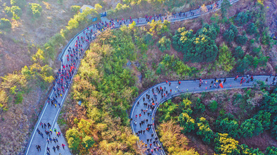 在湖南张家界市,苗鼓迎宾,踏歌起舞,人们一道攀登海拔1080米的黄石寨。专业组选手步伐矫健,冲击佳绩;大众组选手沿途赏景,与亲朋同乐。无论速度快慢,强身健体的目标别无二致。