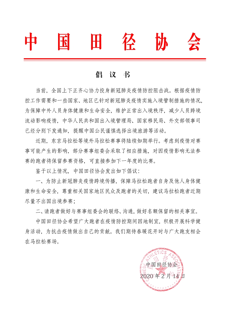 中国田径协会希望广大跑者在疫情防控期间因地制宜,积极开展科学健身活动,为抗击疫情做出自己的贡献。我们期待春暖花开时与广大跑友相会在马拉松赛场。