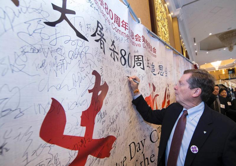 多伦多市长约翰·托里在追思会的“铭记历史、祈愿和平”条幅上签名。