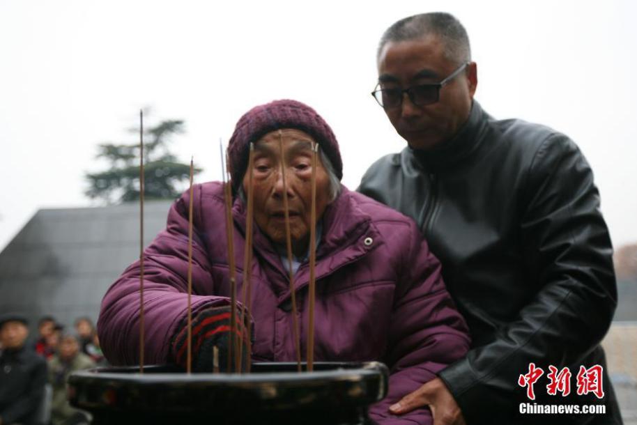 12月7日,南京大屠杀幸存者陈桂香(左)和他的亲属在侵华日军南京大屠杀遇难同胞纪念馆内悼念遇难亲人。中新社记者 泱波 摄