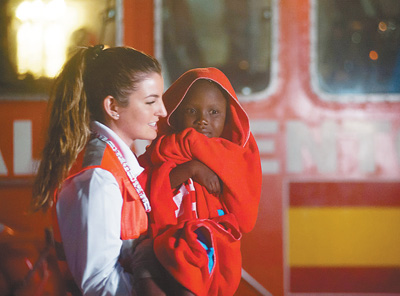 不久前,西班牙海上救援队在地中海搭救一批难民,图为救援队员将难民送至马达加港接受当地红十字会救助。 |