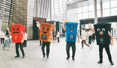 6月19日,上海环球金融中心的物业人员通过舞蹈的形式吸引楼内人员参与了解垃圾分类。 |