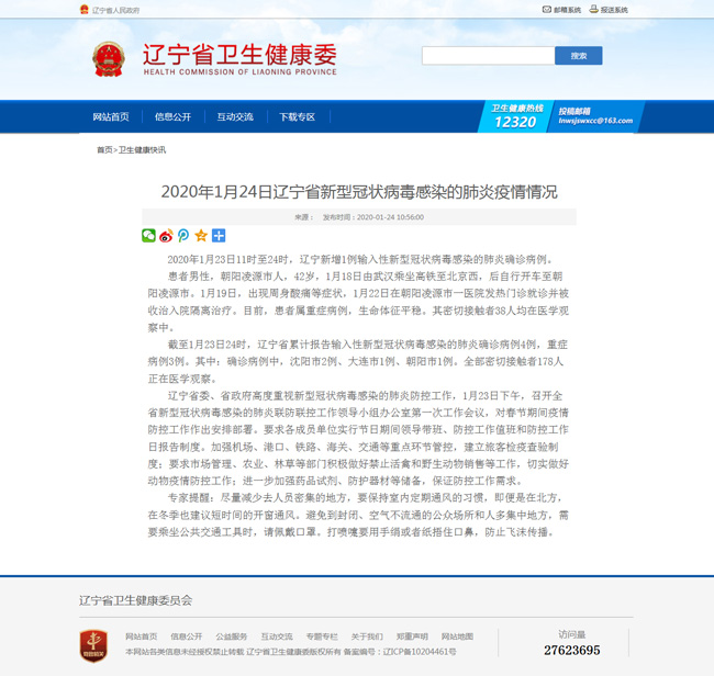 2020年1月23日11时至24时,辽宁新增1例输入性新型冠状病毒感染的肺炎确诊病例。