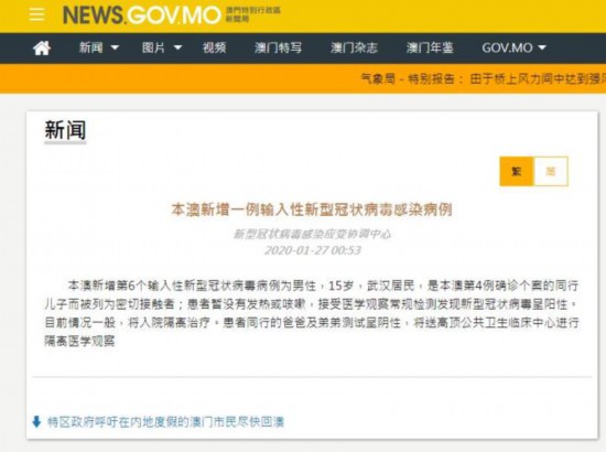 澳门新增1例新型冠状病毒肺炎确诊病例 目前有6人感染 2020-01-27 11:30 来源:中国新闻网 作者: 中国新闻网 字号: 据澳门特区政府新闻局网站消息,澳门新增1例新型冠状病毒确诊病例,目前已有6人感染新型冠状病毒。 通报截图 据通报,澳门新增第6个输入性新型冠状病毒病例为男性,15岁,武汉居民,是澳门第4例确诊个案的同行儿子而被列为密切接触者;患者暂没有发热或咳嗽,接受医学观察常规检测发现新型冠状病毒呈阳性。目前情况一般,将入院隔离治疗。患者同行的爸爸及弟弟测试呈阴性,将送高顶公共卫生临床中心进行隔离医学观察。 责任编辑: 修己 相关阅读 关键词: 复制网址 打印 收藏
