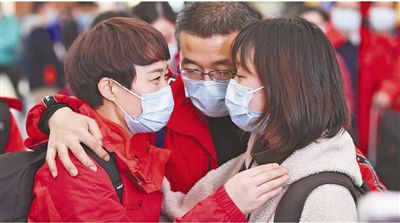 图为26日,重庆市医疗队队员罗月英同女儿和丈夫道别。当日,重庆市医疗队出发支援湖北孝感。 |