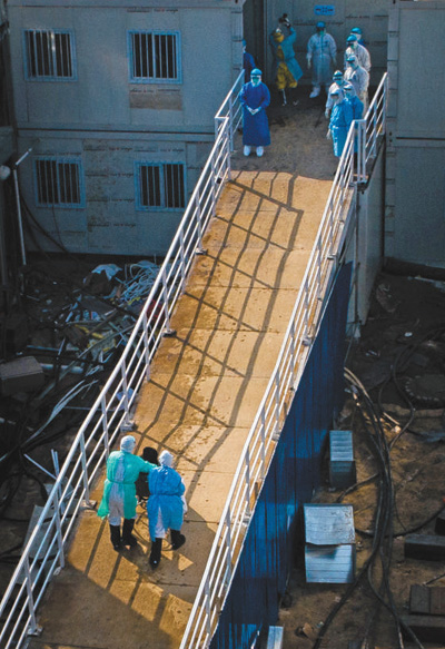 4日,医护人员将患者送入火神山医院病房。 |