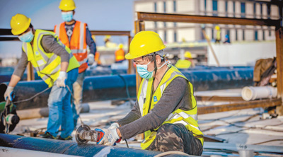4日,雷神山医院建设现场,中建五局三公司工人正在抓紧施工。该院将于近日交付使用。 |