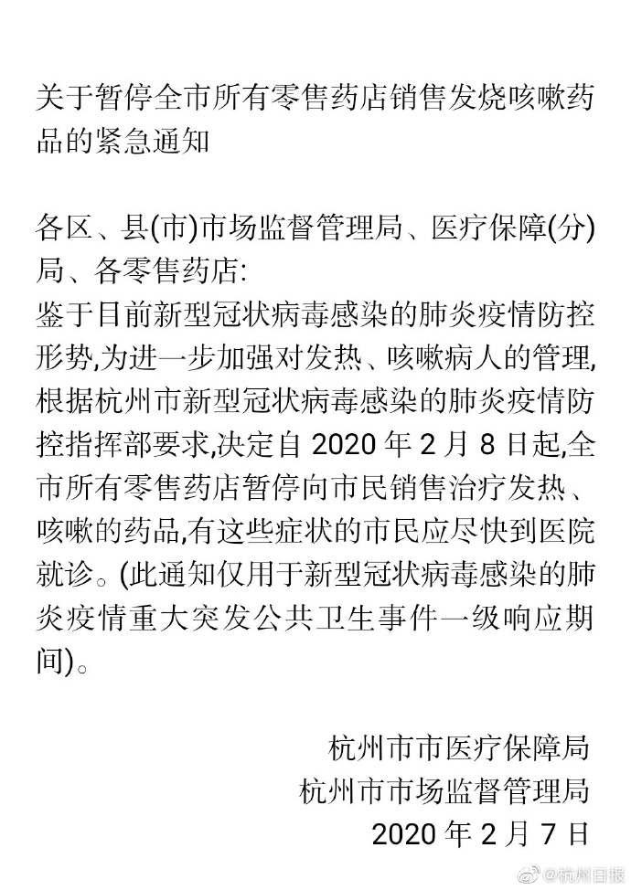 人民网北京2月8日电 据杭州日报官方微博8日消息,杭州市市场监督管理局、杭州市医疗保障局紧急发布了《关于暂停全市所有零售药店销售发烧咳嗽药品的紧急通知》——各区、县(市)市场监督管理局、医疗保障(分)局、各零售药店:鉴于目前新型冠状病毒感染的肺炎疫情防控形势,为进一步加强对发热、咳嗽病人的管理,根据杭州市新型冠状病毒感染的肺炎疫情防控指挥部要求,决定自2020年2月8日起,全市所有零售药店暂停向市民销售治疗发热、咳嗽的药品,有这些症状的市民应尽快到医院就诊。(此通知仅用于新型冠状病毒感染的肺炎疫情重大突发公共卫生事件一级响应期间)。