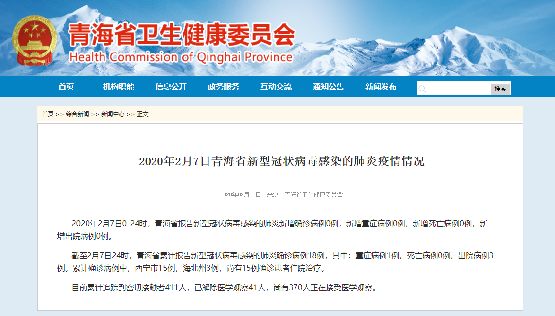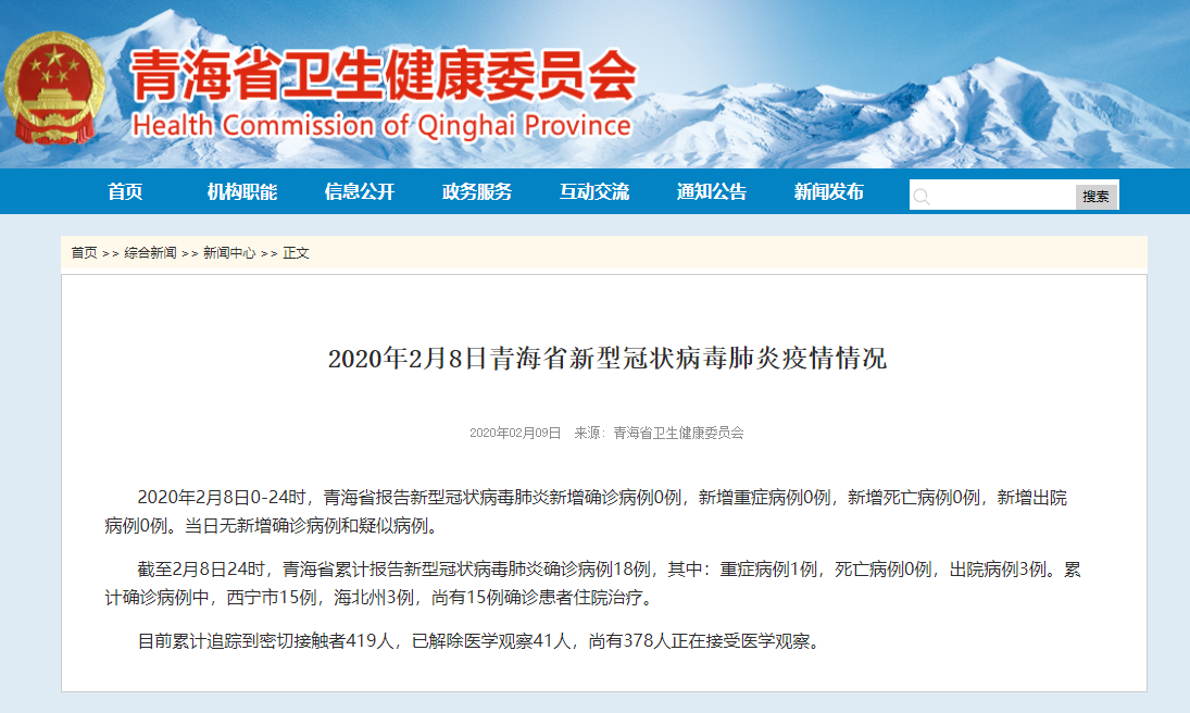 截至2月8日24时,青海省累计报告新型冠状病毒肺炎确诊病例18例,其中:重症病例1例,死亡病例0例,出院病例3例。累计确诊病例中,西宁市15例,海北州3例,尚有15例确诊患者住院治疗。