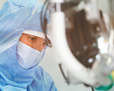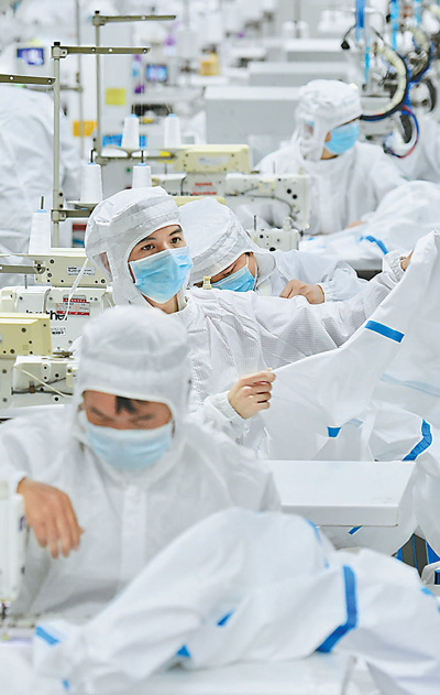 2月4日,福建晋江市一间无菌实验室,工人正在加紧生产防护服,为防疫一线提供物资保障。 |