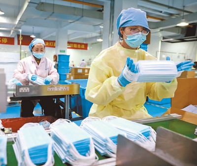 2月9日,黑龙江哈尔滨市一家企业生产车间,工人在加紧生产医用防护物资。 |