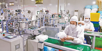 近日,在福建漳州市一家医疗器械公司生产车间内,员工正在逐一清点检查成品口罩。 |