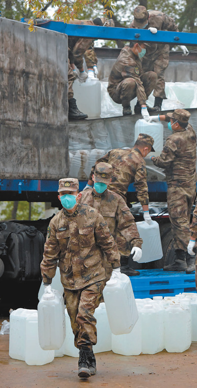 2月10日,河北邯郸市一家爱心组织为火神山医院捐赠的百吨医用消毒原液运抵武汉并予交接,图为医疗队队员在快速搬运医疗物资。 |