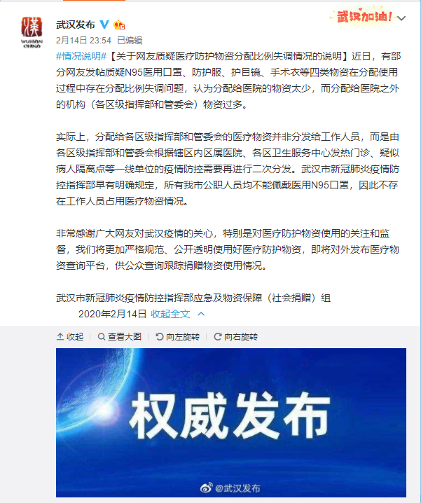 人民网北京2月15日电 近日,有部分网友发帖质疑武汉N95医用口罩、防护服、护目镜、手术衣等四类物资在分配使用过程中存在分配比例失调问题,认为分配给医院的物资太少,而分配给医院之外的机构(武汉各区级指挥部和管委会)物资过多,武汉市互联网信息办公室官方微博回应:
