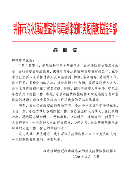 人民网北京2月23日电 “向周继同志表示最诚挚的感谢,感谢他主动请缨参加钟祥市冷水镇疫情防控工作……”这是湖北省钟祥市中医院精神科主治医师周继家乡的疫情防控指挥部写给他的感谢信。感谢他坚守在农村疫情防控的第一线。