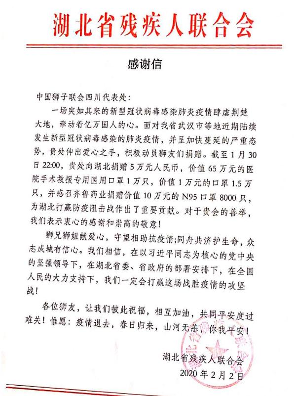 近日中国狮子联会四川代表处收到湖北省残疾人联合会发来感谢信,表示中国狮子联会四川代表处的迅速响应,有力地支持到一线防疫医务工作者和残疾人群众。疫情虽危难,我们相信,在党和政府的领导下,在全国人民的支持下,我们一定会打赢这场战胜疫情的攻坚战。