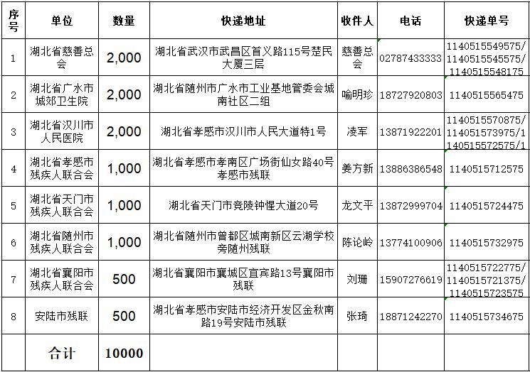 本批捐赠物资按照湖北省慈善总会及湖北省残疾人联合会的分配方案,分别捐赠到了湖北省慈善总会2000个、湖北省广水市城郊卫生院2000个、湖北省汉川市人民医院2000个、湖北省孝感市残疾人联合会1000个、湖北省天门市残疾人联合会1000个、湖北省随州市残疾人联合会1000个、湖北省襄阳市残疾人联合会500个、湖北省安陆市残疾人联合会500个。