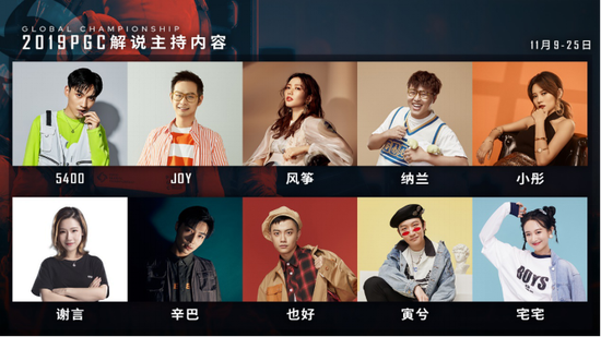 同时,在PGC2019全球总决赛的中文解说台上,来自PCL赛区的官方解说们还将全称为大家带来精彩的赛事。