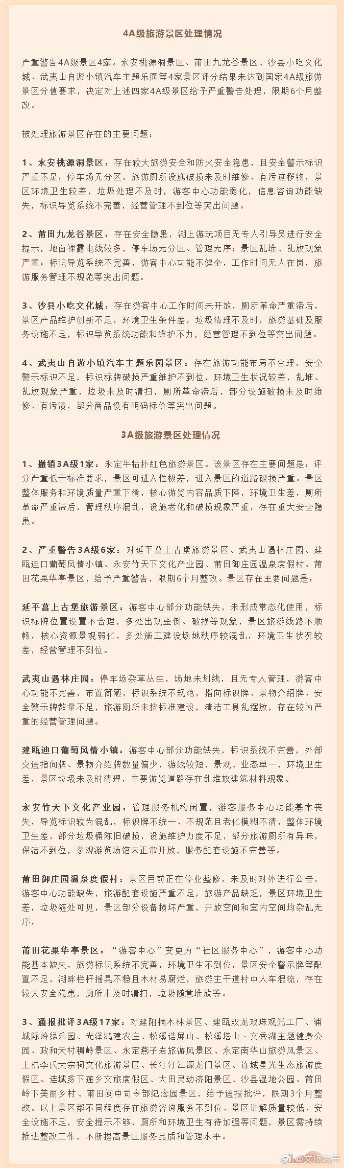 沙县小吃文化城等28家福建A级旅游景区被处理 2019-09-13 08:41 来源:人民网 作者: 冯粒 字号: 人民网北京9月13日电(冯粒)据文化和旅游部官方微博“文旅之声”消息,福建省旅游资源规划开发质量等级评定委员会近日对外通报,经专家组对全省A级旅游景区进行实地复核检查,决定对永安桃源洞景区、莆田九龙谷景区、沙县小吃文化城、武夷山自遊小镇汽车主题乐园景区等4家4A级景区给予严重警告处理,限期6个月整改;对永定牛牯扑红色旅游景区等24家3A级景区分别给予摘牌、严重警告和通报批评的处理;对17家3A级景区给予通报批评。 责任编辑: 修己 相关阅读 关键词: 复制网址 打印 收藏