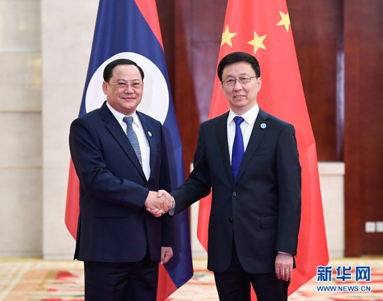 9月20日,中共中央政治局常委、国务院副总理韩正在广西南宁会见出席第十六届中国—东盟博览会和中国—东盟商务与投资峰会的老挝副总理宋赛。 新华社记者 申宏 摄