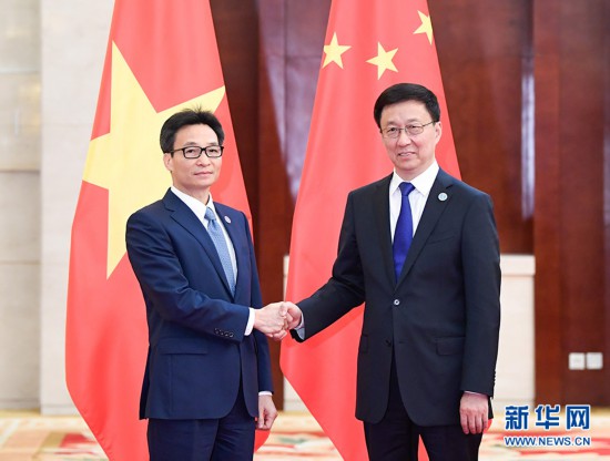 9月20日,中共中央政治局常委、国务院副总理韩正在广西南宁会见出席第十六届中国—东盟博览会和中国—东盟商务与投资峰会的越南副总理武德担。 新华社记者 申宏 摄