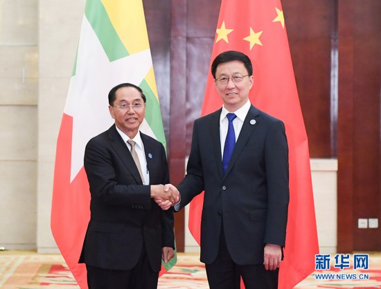 9月20日,中共中央政治局常委、国务院副总理韩正在广西南宁会见出席第十六届中国—东盟博览会和中国—东盟商务与投资峰会的缅甸副总统敏瑞。 新华社记者 申宏 摄